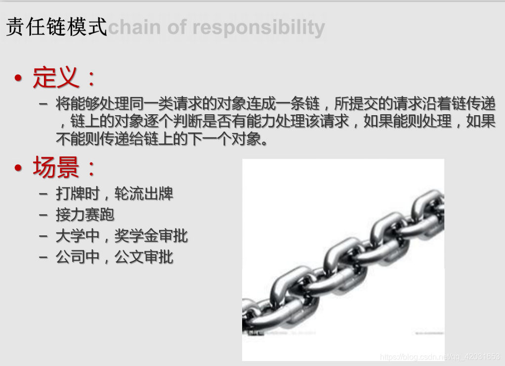 – Java中,异常机制就是一种责任链模式。一个try可以对应多个catch,当第一个catch不匹配类型,则自动跳到第二个catch.