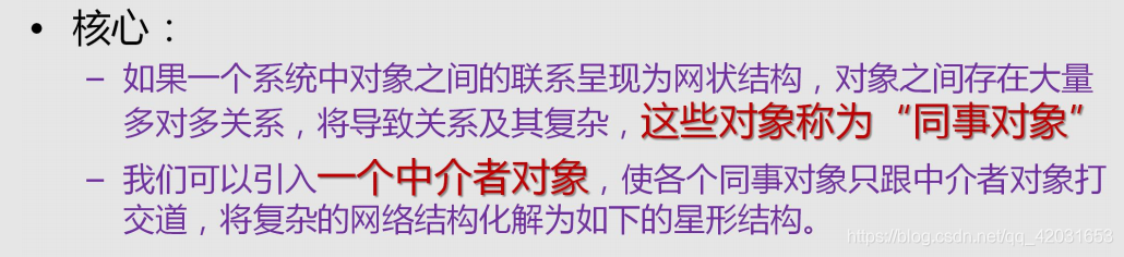 – 解耦多个同事对象之间的交互关系。每个对象都持有中介者对象的引用,只跟中介者对象打交道。我们通过中介者对象统一管理这些交互关系