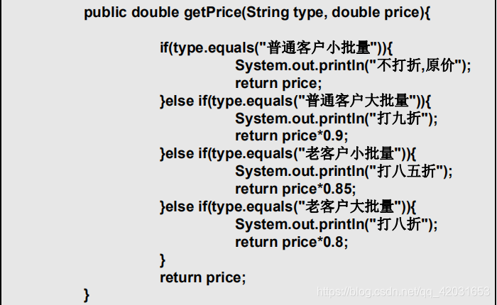 假如,类型特别多,算法比较复杂时,整个条件控制代码会变得很长,难于维护。