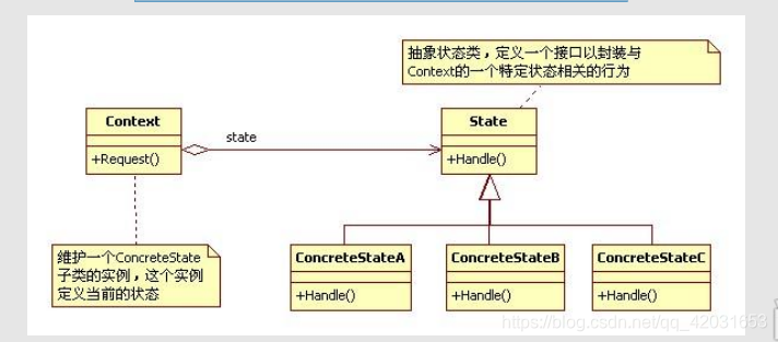 • 环境类中维护一个State对象,他是定义了当前的状态。