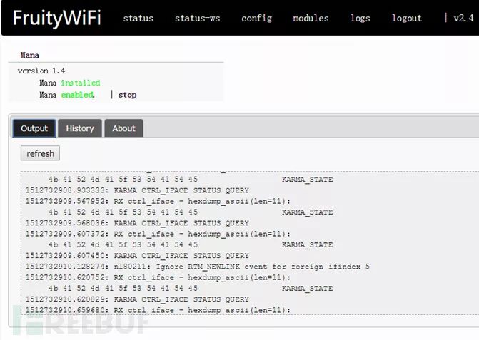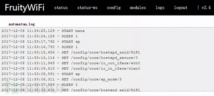 进入FruityWifi的web管理界面后可以看到目录上的几个选项。