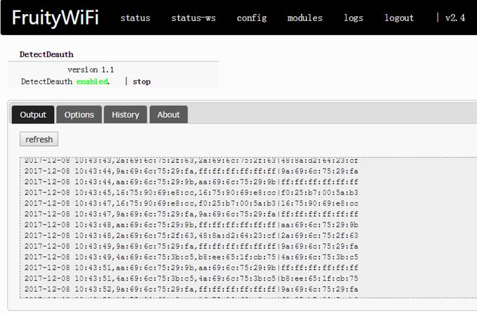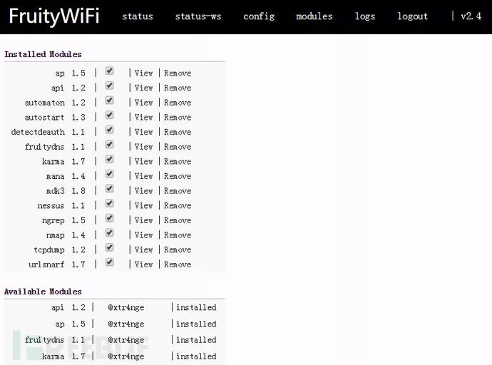 modules:这里列出了许多可用的插件,可供下载使用。树莓派3B自带的无线网卡是不支持monitor模式的,如果想使用mdk3这种需将网卡设置为monitor模式的模块,需外置个支持monitor模式的USB无线网卡。