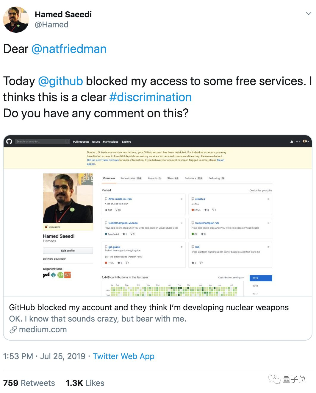 哈梅德很快发现,个人GitHub页面也被禁止,共有开源库也不能访问了。