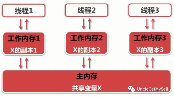 共享变量:如果一个变量在多个线程的工作内存中都存在副本,那么这个变量就是这几个线程的共享变量