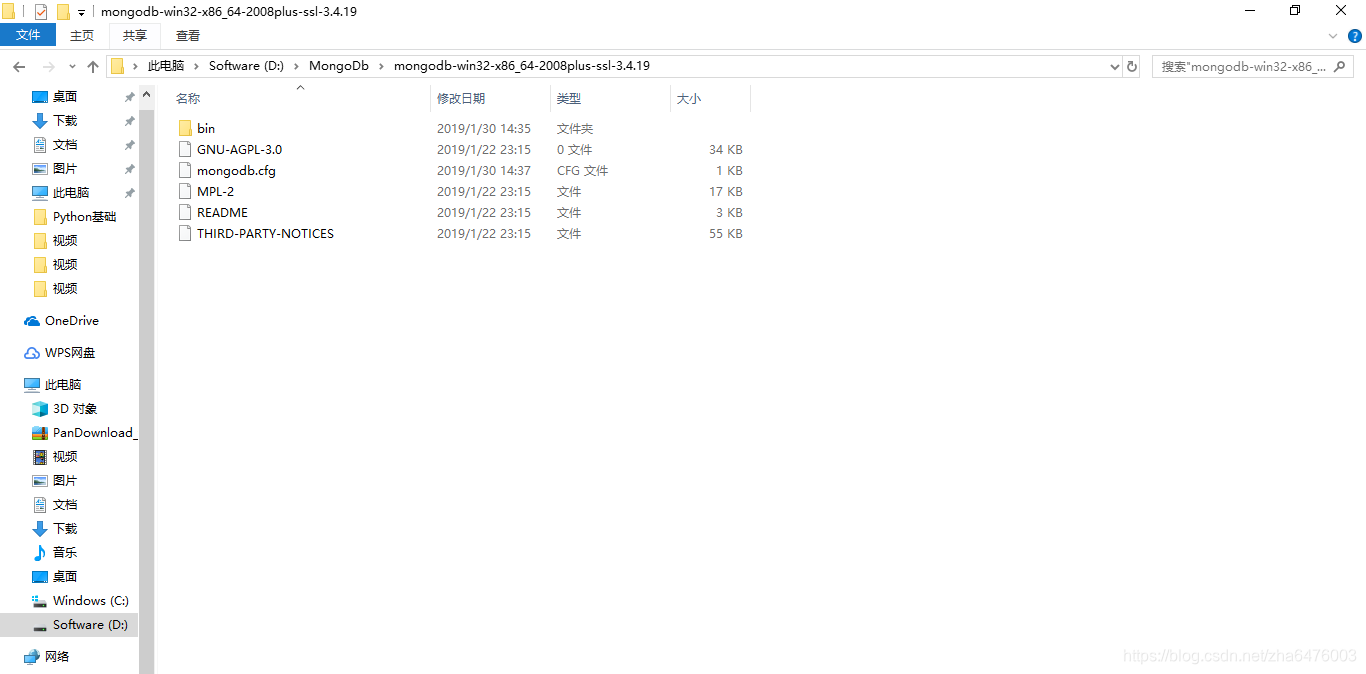 2.1 将下载的zip文件解压到一个文件夹,我这里解压到D:\MongoDb\mongodb-win32-x86_64-2008plus-ssl-3.4.19,如下图所示: