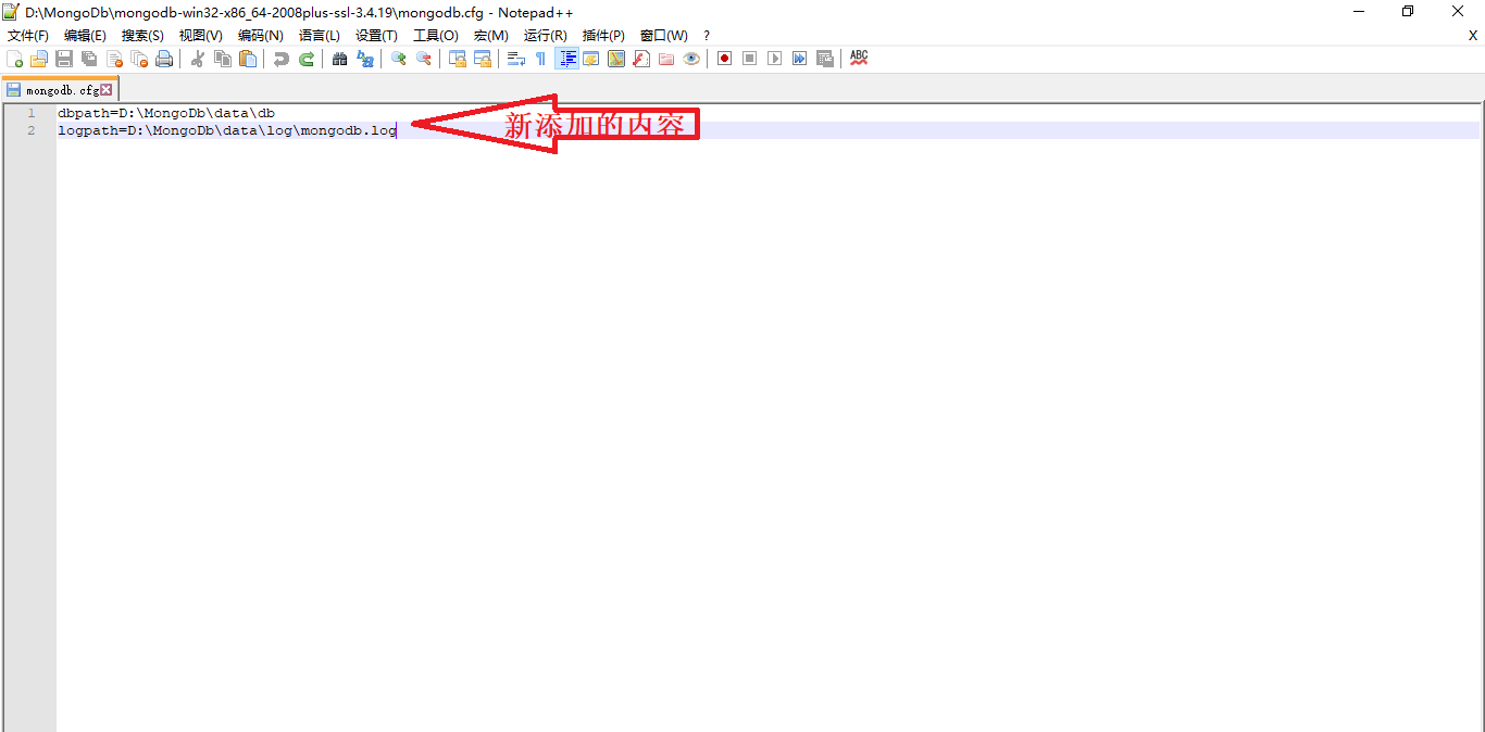 2.3 继续在解压文件的D:\MongoDb\mongodb-win32-x86_64-2008plus-ssl-3.4.19路径下创建一个mongodb.cfg 配置文件,并在里面添加上面新建的配置文件夹路径: