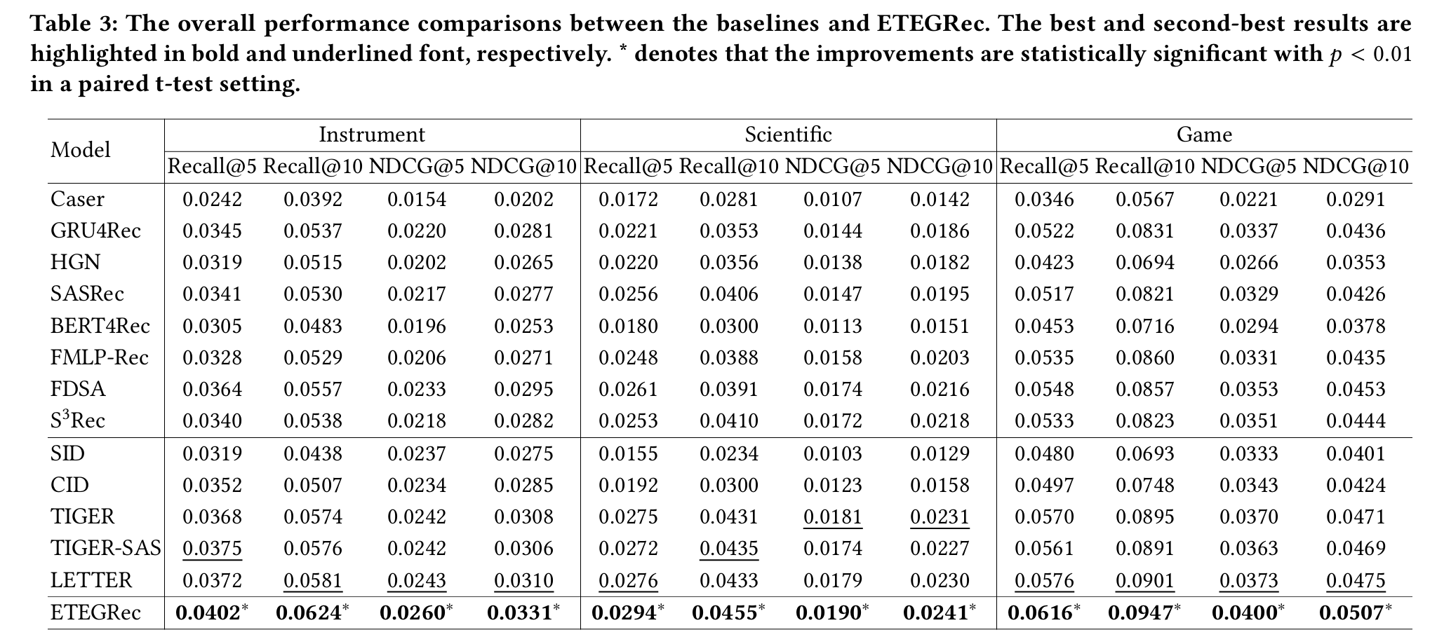 我们在三个公共推荐基准上评估了 ETEGRec。表 3 给出了总体结果,主要观察如下: