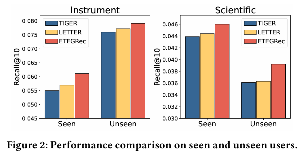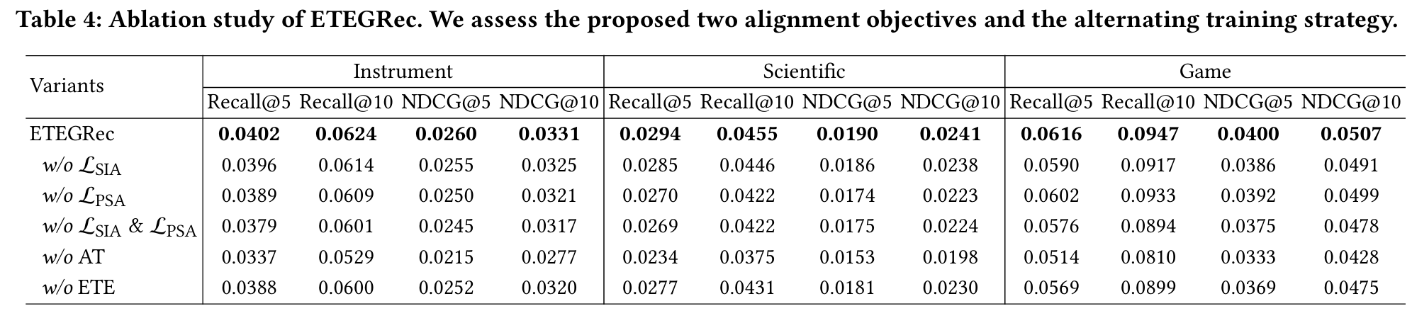 - w/o LSIA: 去除序列—物品对齐(SIA,式(15))。该变体在各数据集上均劣于完整 ETEGRec,表明在码本空间中对齐序列表示与物品表示有助于生成式推荐。