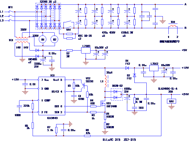 - L7812稳压+12V, 作为"升压开关电源"振荡芯片KA3843 和 "控制电路"的工作电源;