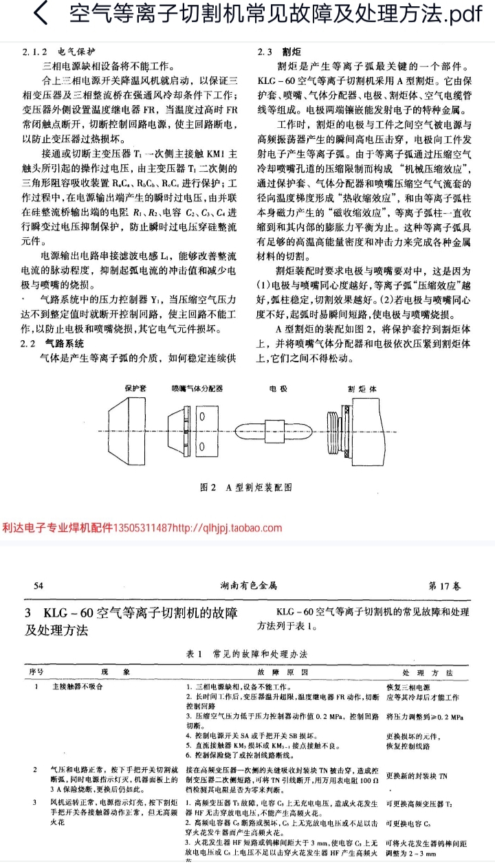 注意: 在HF通电前,高速压缩空气流已工作,将产生的 “电弧”吹向工件,