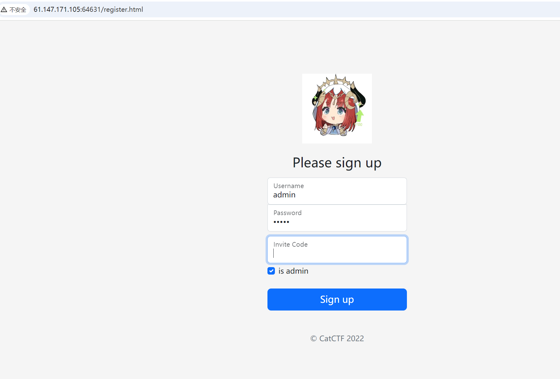 进入题目环境,首先进入sign up创建一个admin用户,下方有勾选 is admin,打上勾