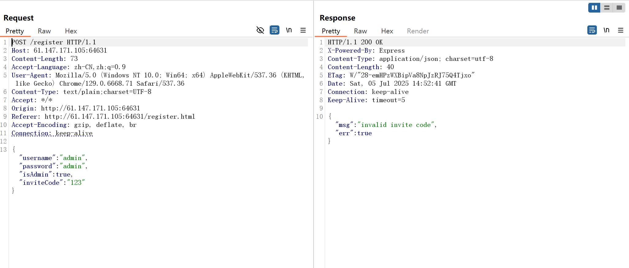 测试了一会儿,发现加上__proto__ 这个继承对象的属性payload后,不需要管Invite Code是什么,也能注册成功
