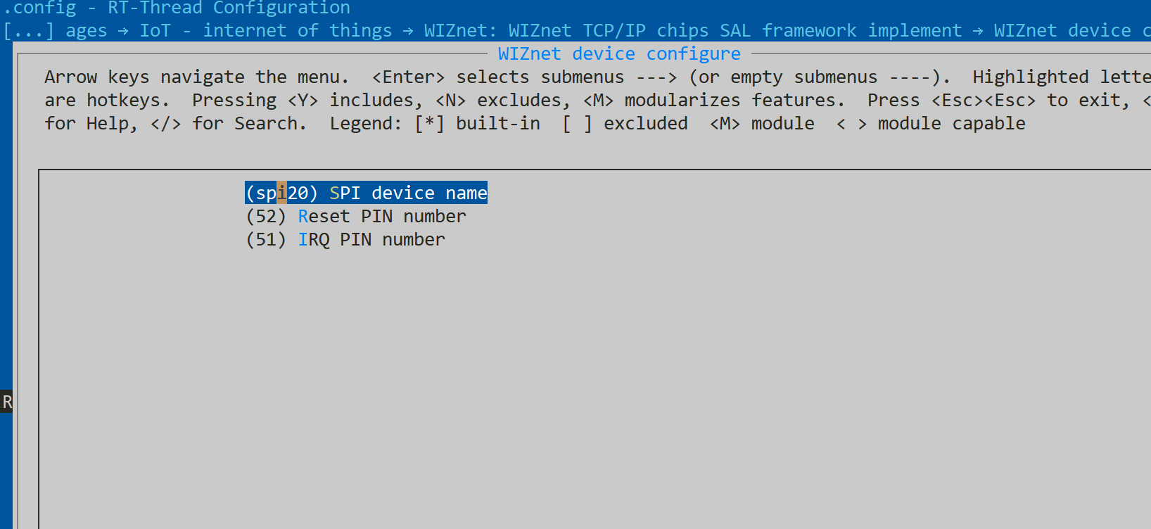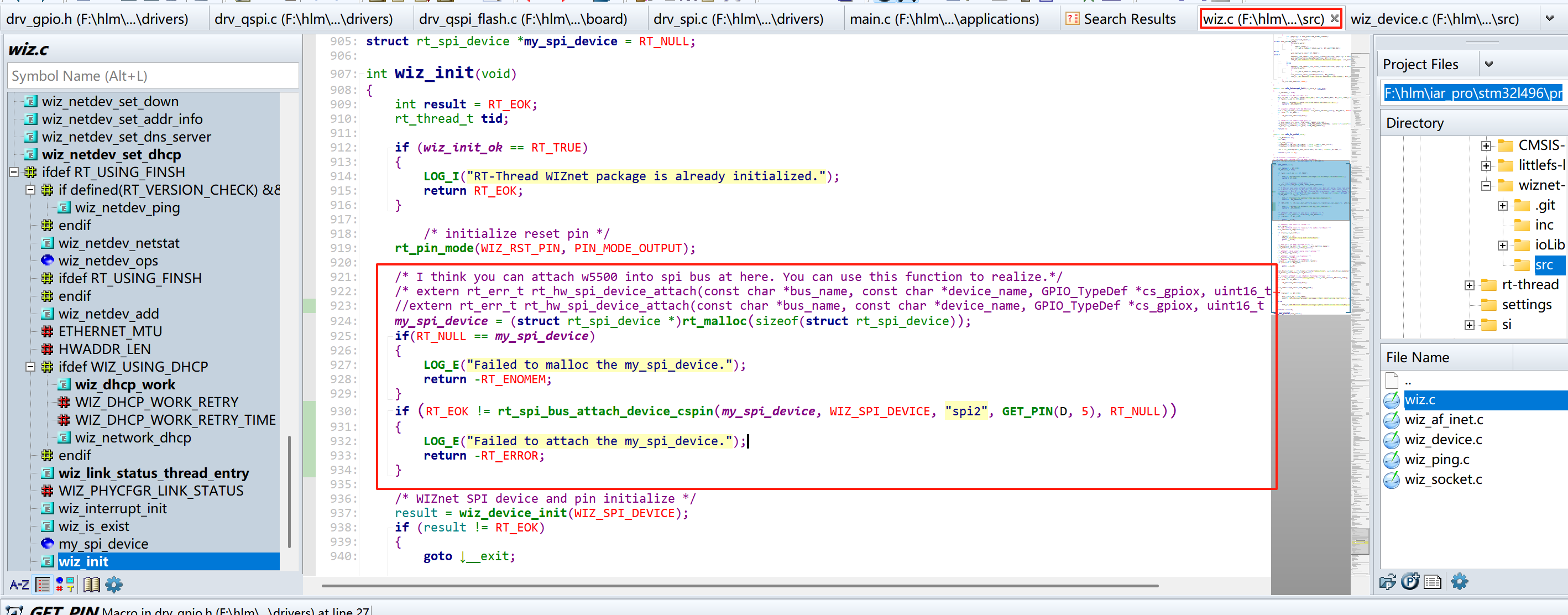 编译运行后提示让我注册spi设备到总线上,定位在wiz.c文件中,原来wiz初始化时,有注释提示我们要注册设备到总线上,因为我的内核是rt-thread5.1.0的,所以用它注释的注册总线方法是不好使的,我用我当前版本的方式进行设备注册到总线上