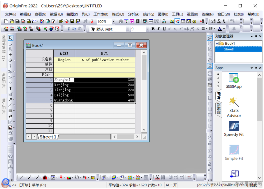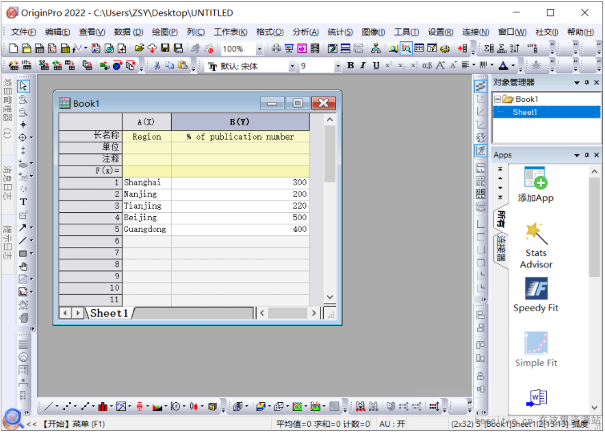 1、先打开Origin2022软件,然后在Book1中输入如下示例数据: