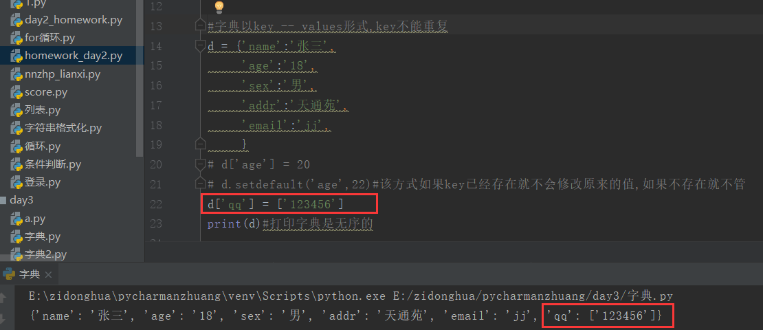 2.字典增加值用 字典名['xxx'] = ['xxx'] 和setdefault