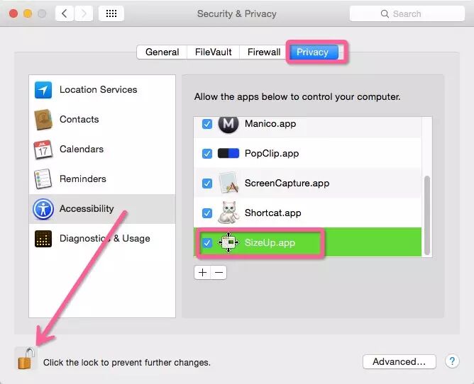 直接点击Open System Preferences或者打开System Preferences,点击Security & Privacy图标,在PrivacyTab内,点击Accessibility,然后将SizeUp加到右边的列表里面。(提示:你可能需要先点击右下角的黄色锁,输入密码后才能编辑右边的列表。)