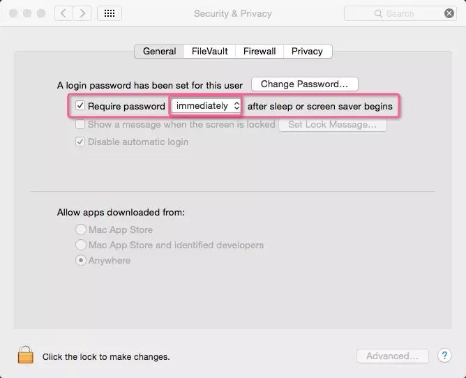 再打开System Preferences,点击Security & Privacy图标,在GeneralTab内,勾选Require password[immediately] after sleep or screen save begins。