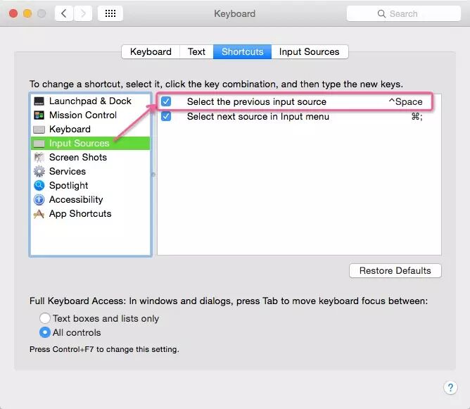 系统自带的输入法不是很好用,推荐安装搜狗输入法或者RIME输入法。安装完成后,打开System Preferences,选择Keyboard,切换到Shortcuts这个Tab下,勾选Select the previous input source,并点击上述文字后面的空白处,设置快捷键为Ctrl+Space(即如图所示的^Space)。