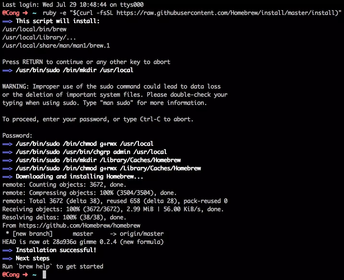 Homebrew就是这样一款终端下的命令程序包管理器,安装非常简单,复制如下命令在终端下运行,按回车并输入密码后等待安装成功: