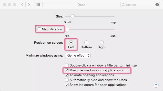 关闭Magnification特效(即鼠标放到Dock上图标放大的效果,此效果干扰注意力)
