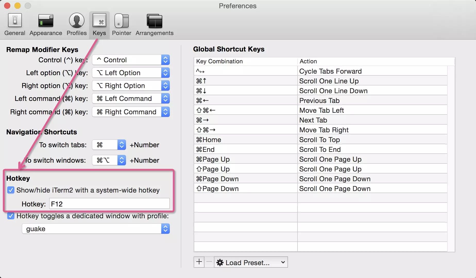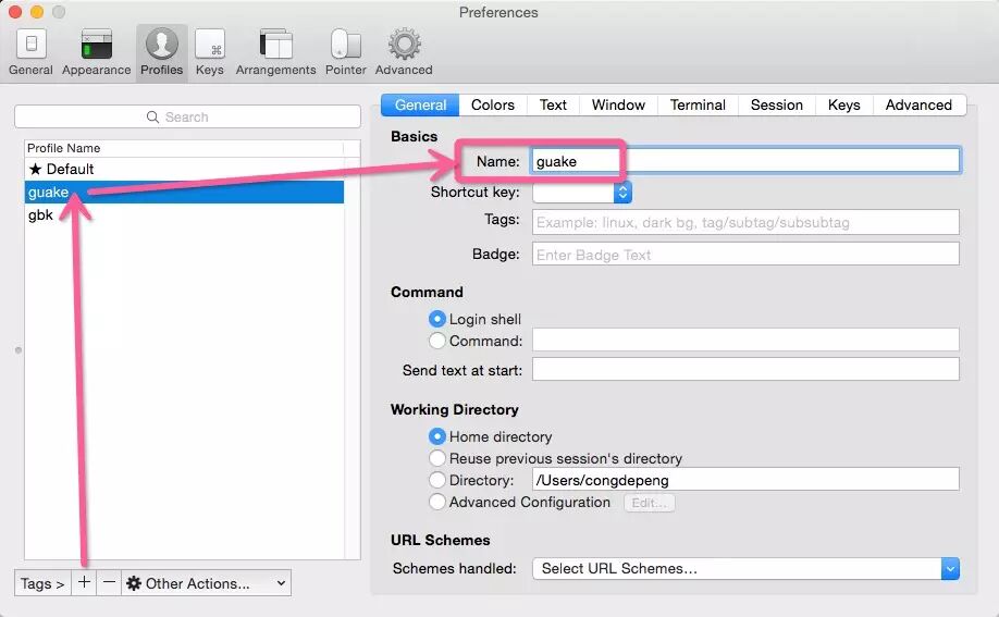 打开iTerm的Preferences..., 在ProfilesTab里面,点击下面的[+]添加一个新的profile,为什么要新建一个profile?答案是为了定制将来弹出的终端样式和大小等等参数。新的profile假设命名为guake,(注:guake这个名称是为了向Linux下的Guake终端致敬),你可以自己任意起个名称,下面会用到。