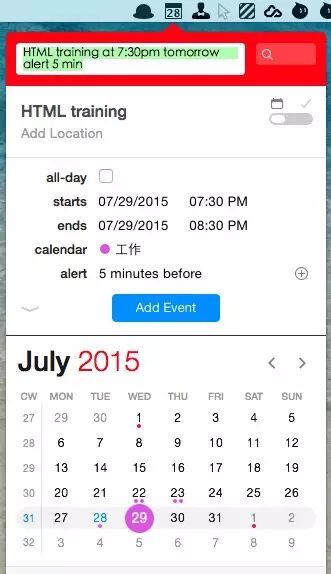 打开Fantastical 2的网站,你一定会被她漂亮的外表所吸引,最可贵的是Fantastical还很聪明,当你在日历里面新建一个提醒的时候,输入如下内容“HTML training at 7:30pm tomorrow alert 5 min”, 则Fantastical会自动将日期设置为明天,然后将开始时间设置为晚上7点半,并且提前5分钟提醒,是不是很聪明?