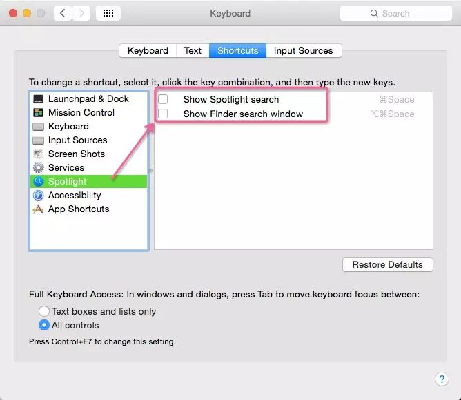 打开System Preferences,选择Keyboard,切换到Shortcuts这个Tab下,点击Spotlight,取消对应的2个快捷键设置。