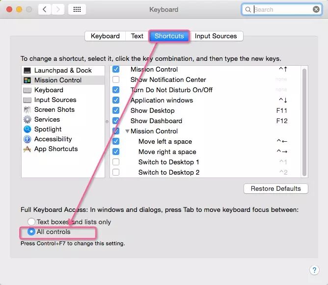 如图,首先打开System Preferences,点击Keyboard图标,选择Shortcuts这个Tab, 选中All controls