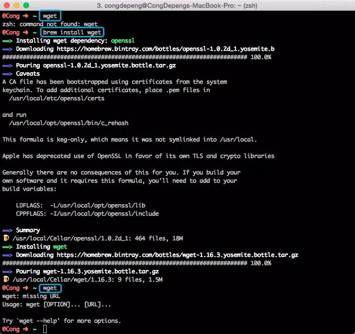 curl和wget是命令行下面常用的命令,其中curl已经默认安装在OS X中了,但是wget没有默认安装,下面演示如何使用Homebrew来安装wget。