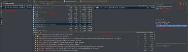 打印获得的内存信息如下,可以通过右上角的绿色三角形按钮去分析泄漏的 Activity 和 一些重复的字符串,目前只支持这两个,希望 Google 后面能够加入更多可选分析规则