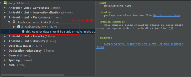 对可能引起泄漏的编码,Lint 都会进行温馨提示。