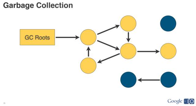 对于不同的语言平台来说,进行标记回收内存的算法是不一样的,像 Android(Java)则采用 GC-Root 的标记回收算法。下面这张图就展示了 Android 内存的回收管理策略(图来自Google 2011的IO大会)