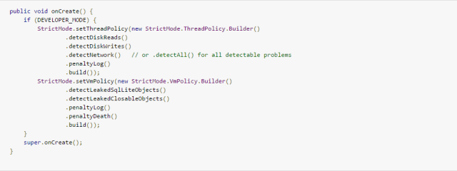 以官网的示例代码为栗子,一般 StrictMode 只在测试环境下启用,到了生产环境就会进行关闭,通常我们都会借助 BuildConfig.DEBUG 来实现。