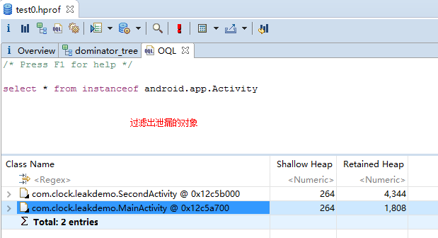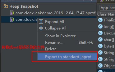 使用该命令可以很直观的观察到 Activity 的泄漏问题,是我平常分析比较常用的一种方式。除了使用命令外,AndroidStudio 也提供了下面的功能,和使用命令是一样效果的。