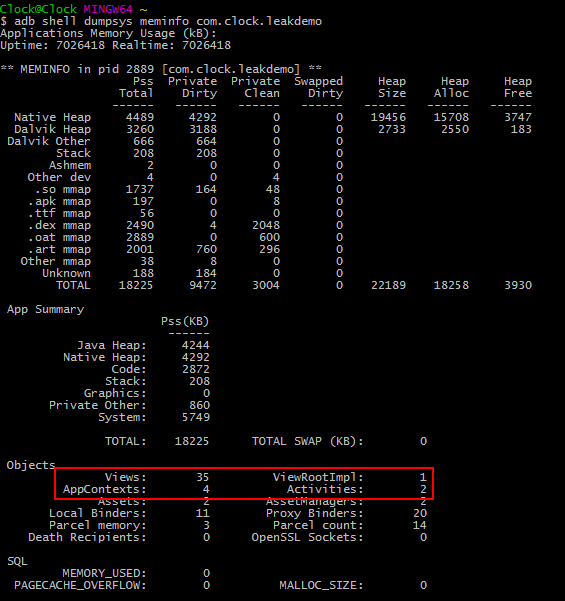 使用 adb shell dumpsys meminfo [PackageName],可以打印出指定包名的应用内存信息