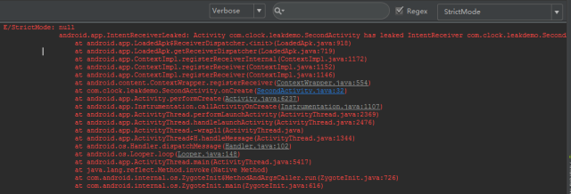 启用 StrictMode 后,在过滤日志的地方加上 StrictMode 的过滤 Tag ,如果手机连接着电脑进行开发,定期观察一下 StrictMode 这个 Tag 下的日志,一般你看到一大堆红色告警的 Log.就需要好好排查一下是否跟内存泄漏有关了。