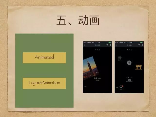 RN有两个动画组件。Animated适合做比较精细的视图动画控制。LayoutAnimation比较适合做过场动画。