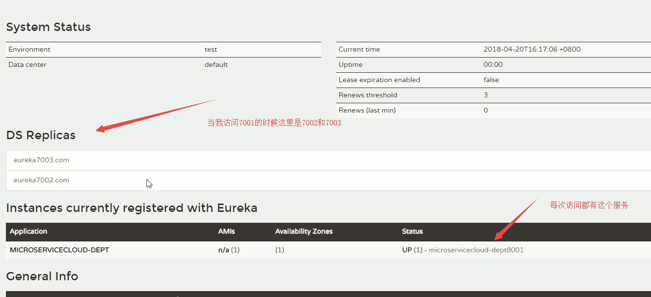 当我访问eureka7001.com:7001的时候DS Replicas中会出现 eureka7002.com:7002、eureka7003.com:7003 ,访问剩下两个同理。
