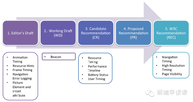 整套标准包含了10余种API,各自针对性能检测的某个方面。为了保证整套标准的质量与互操作性,W3C按照惯例对它们应用了规范成熟度流程,这些API各自处于流程的不同阶段。在下图中可以看到它们当前的进展: