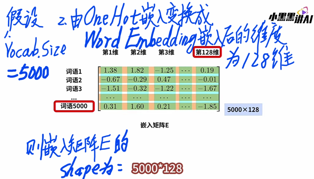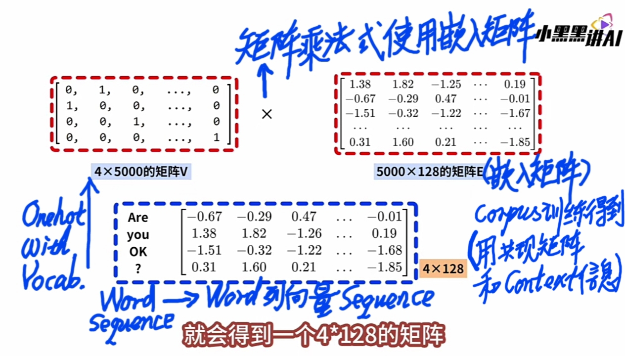 →Input变长词序列→Onehot"词列向量"序列→矩阵乘"嵌入矩阵E"→Embedded"词列向量"序列"