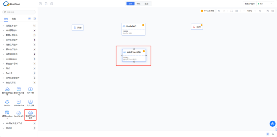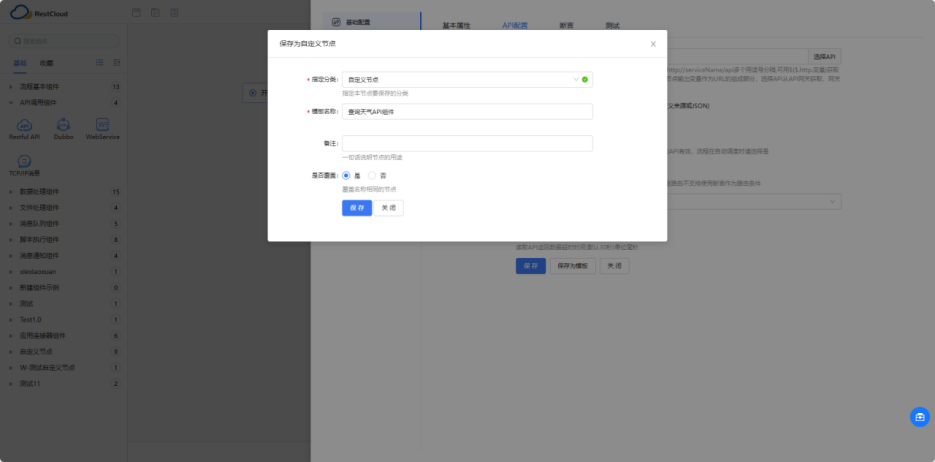 RestCloud可视化编排平台可以将用户编辑好的API调用组件保存为可复用的API调用组件,通过可视化图形化页面拖拽使用,组件可以在多个编排流程中重复使用,减少重复开发工作。