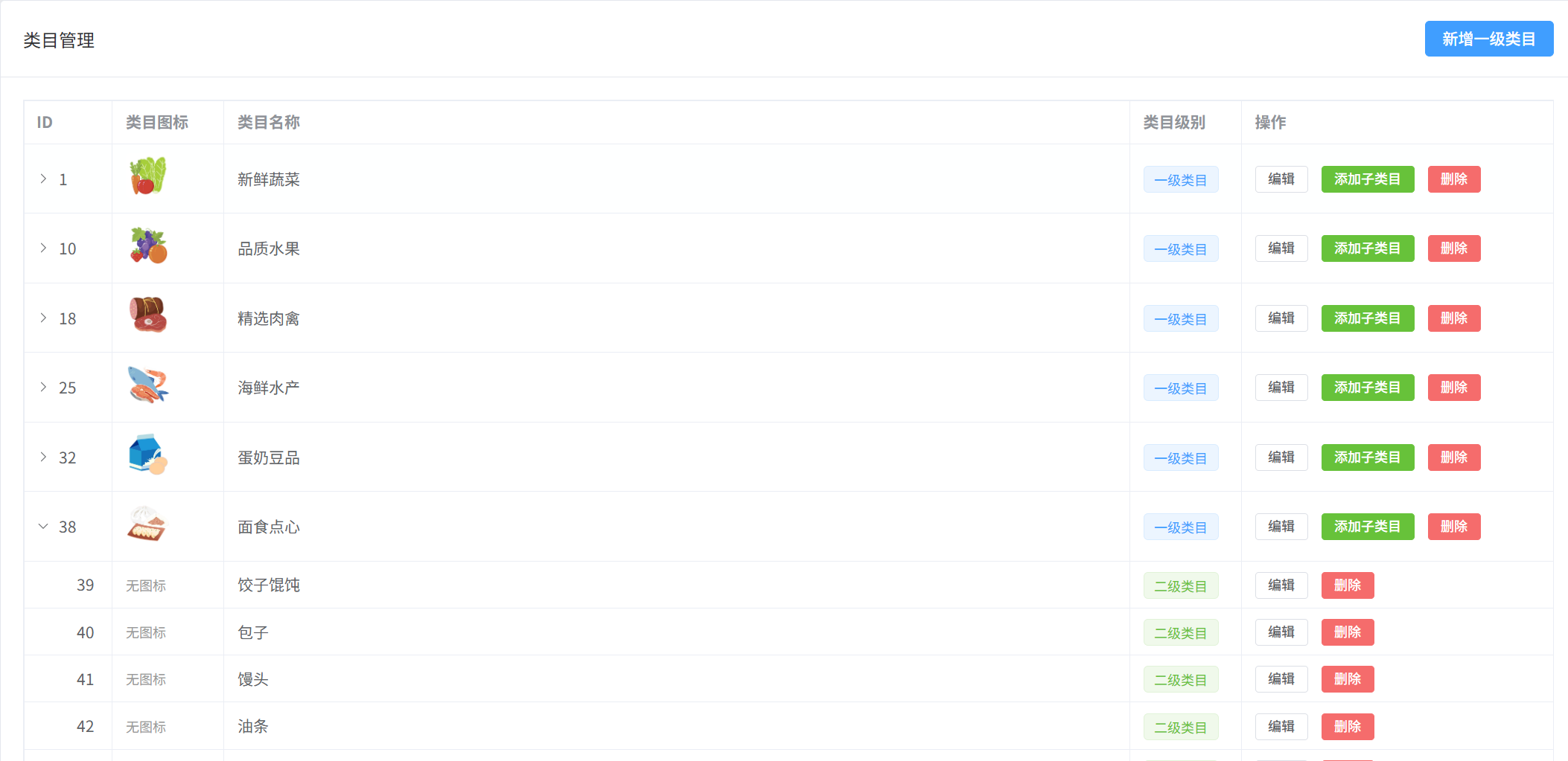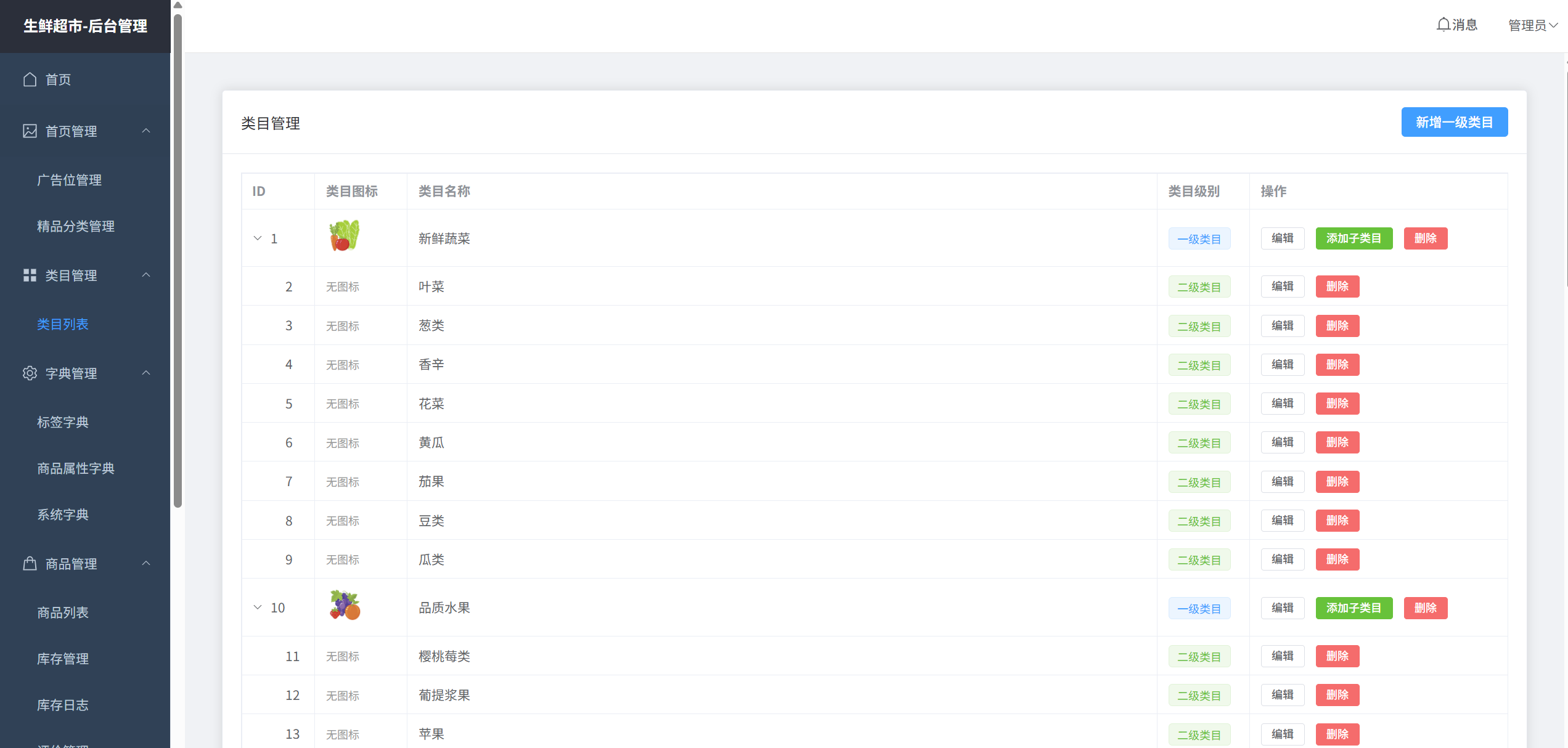 在后端管理你可以随意的对类目进行编辑删除,一级类目需要一个小图标, 二级类目是不用的。