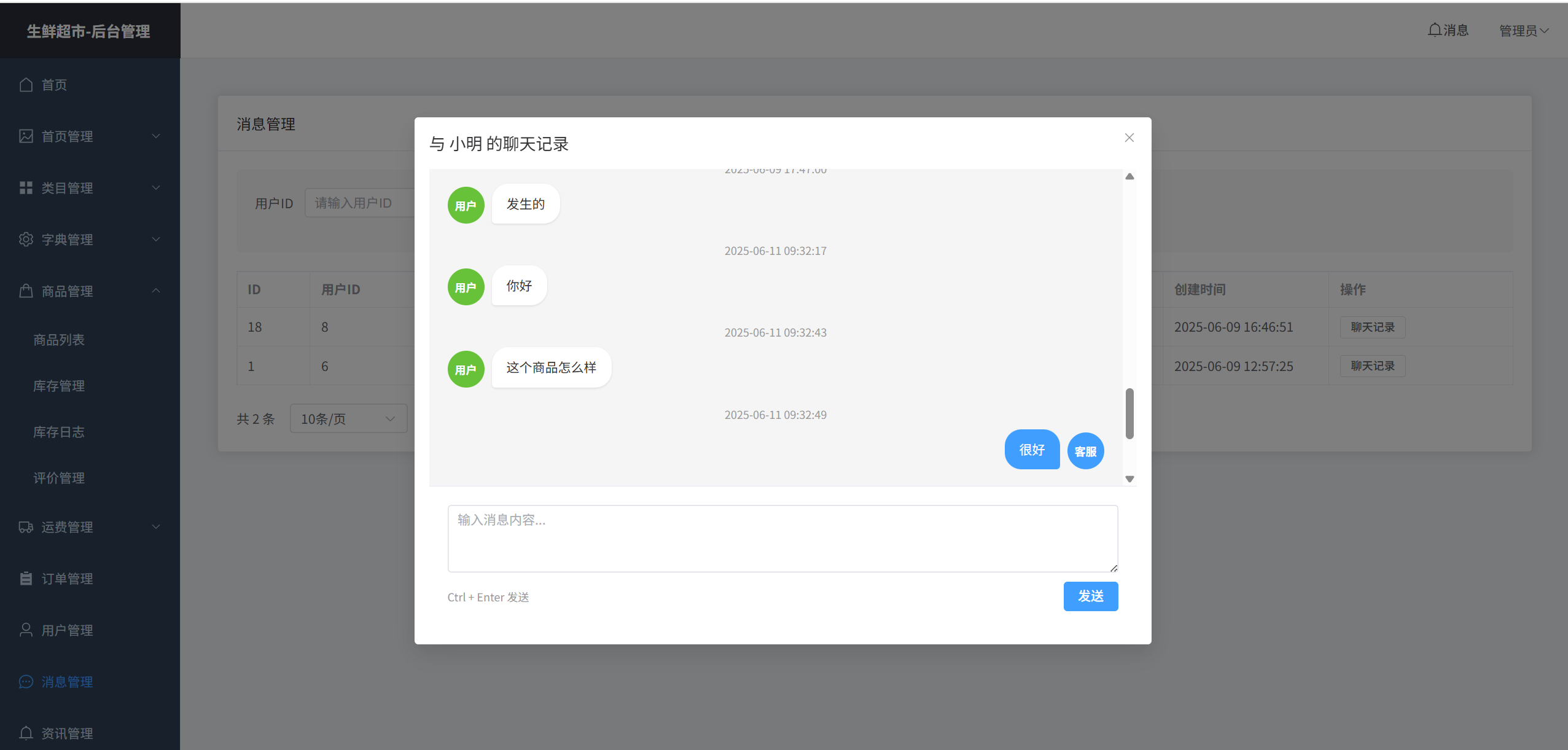 每个用户当登录成功后,在页面的右下角可以联系客服, 当发送消息成功后, 后端台管理就能够看到右上角的消息红点,点击消失,跳转到和客户的聊天列表, 就可以查看聊天记录,聊天记录类似微信,qq等的聊天面板,只能发送文字。用户和管理员可以实时的进行聊天。