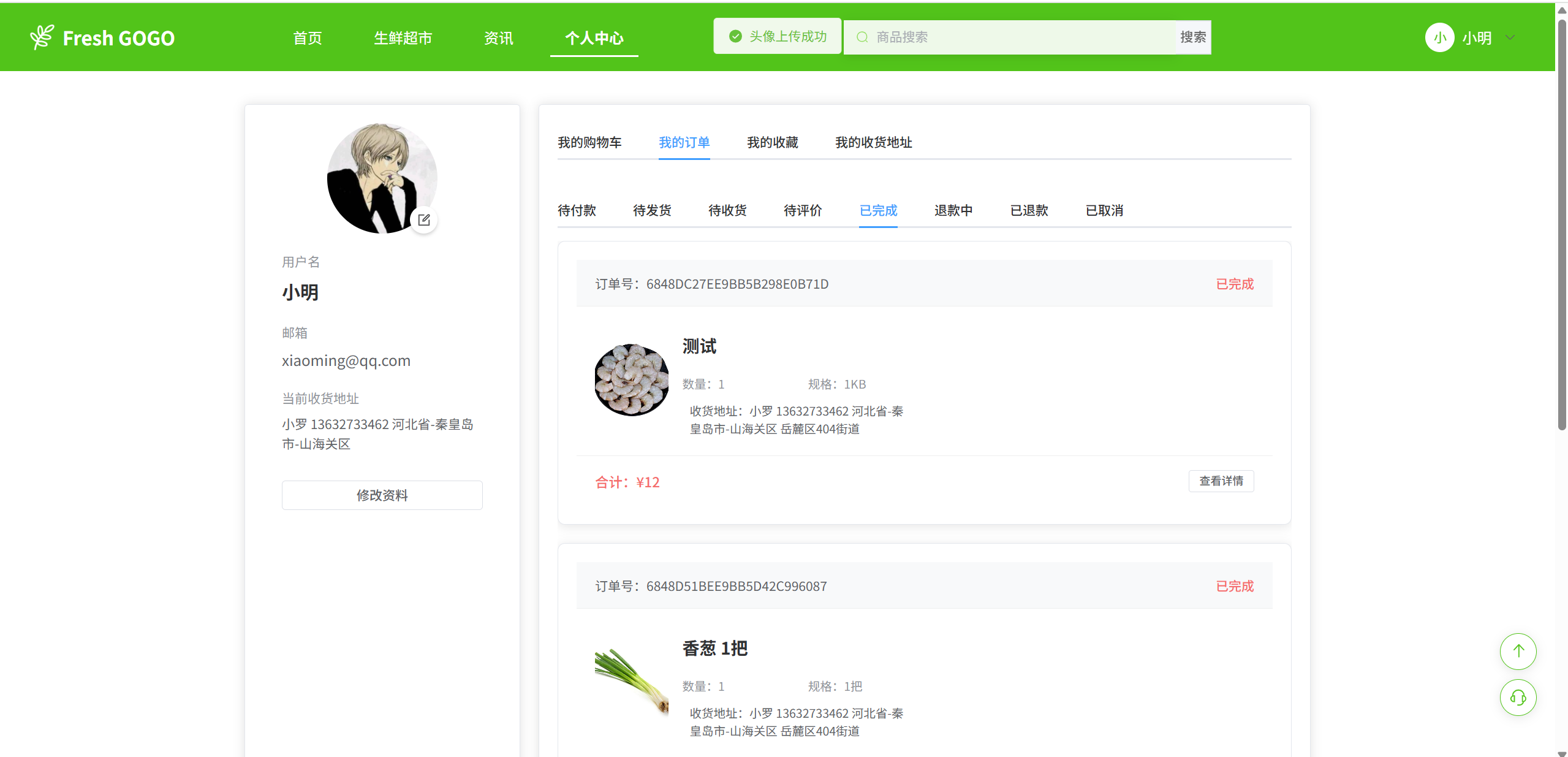 前端可以对用户的用户名,头像进行修改, 还可以修改默认的收获地址。