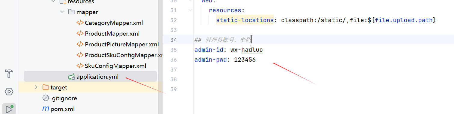 打开resources目录, 修改 application.yml 配置文件,主要修改下面几个信息: