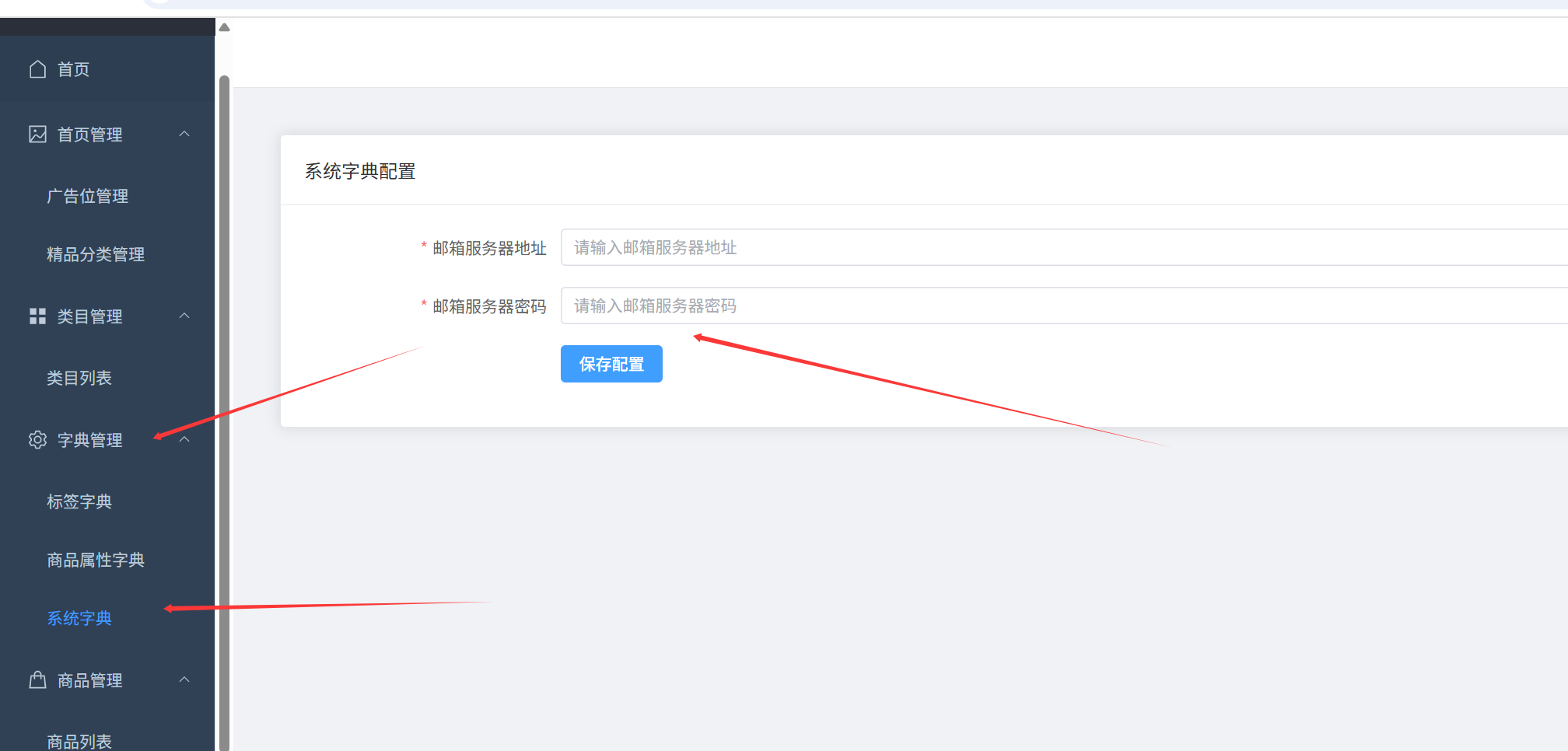用户有头像,用户名,邮箱,密码,是否禁用,当前收获地址等属性。用户前端注册是通过邮箱验证码来注册,所以系统初始化时,需要在后台管理的字典管理的系统字典里面设置好邮箱服务器,然后才可以进行正确的注册。