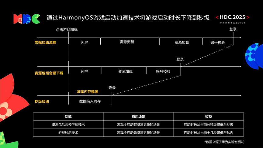 开发者可通过调用ArkTS API,将启动流程中必须的数据加载到内存,在启动时基于已有数据自定义加速流程。依托于鸿蒙内核,内存压制到全量换出的全过程,用户侧均无感,在几秒内即可直达游戏登陆界面。