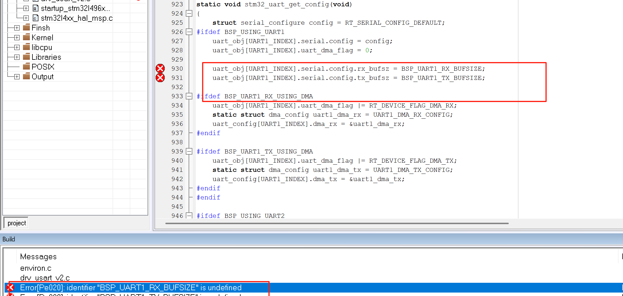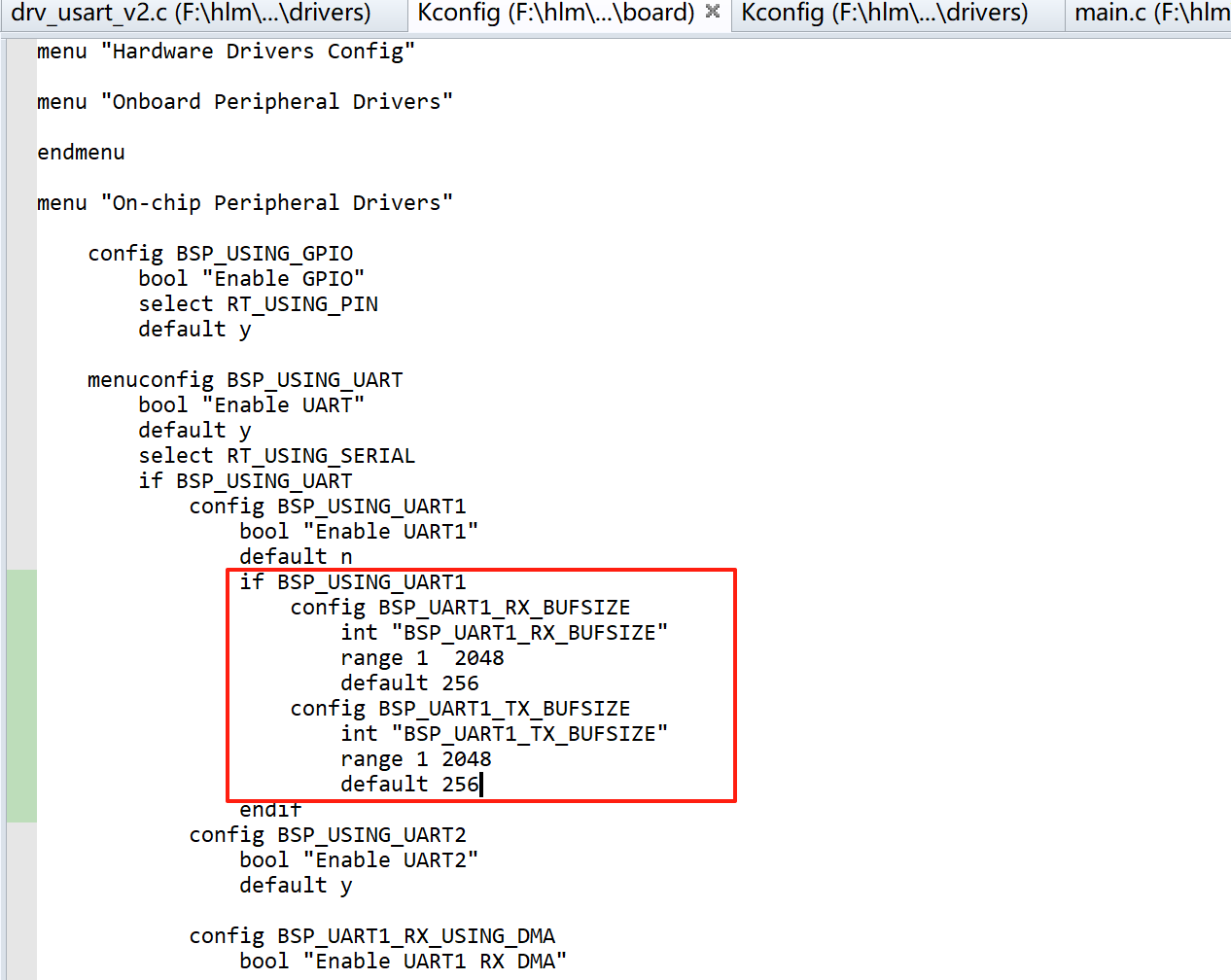 编译后报错,原因是使能串口1后,串口1的发送和接受buf长度未指定,而这两个宏又找不到,说明没有所以采用menuconfig kconfig的形式指定