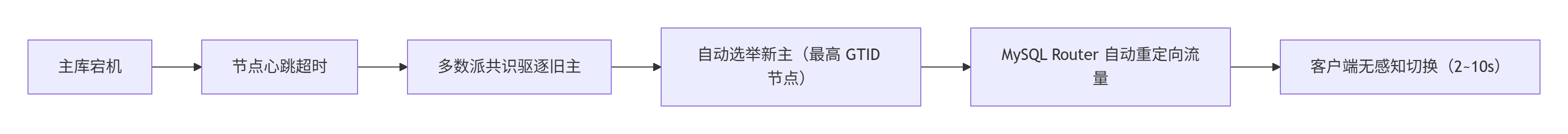 MySQL 官方推荐的高可用架构,提供分布式强一致性与全自动故障转移,适应云原生与核心业务场景,但需至少 3 节点和低延迟网络。