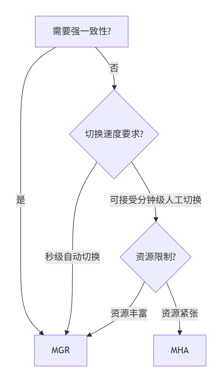 | 云环境或容器化部署 | MGR | 无依赖 SSH/VIP,原生适应动态 IP 环境 |